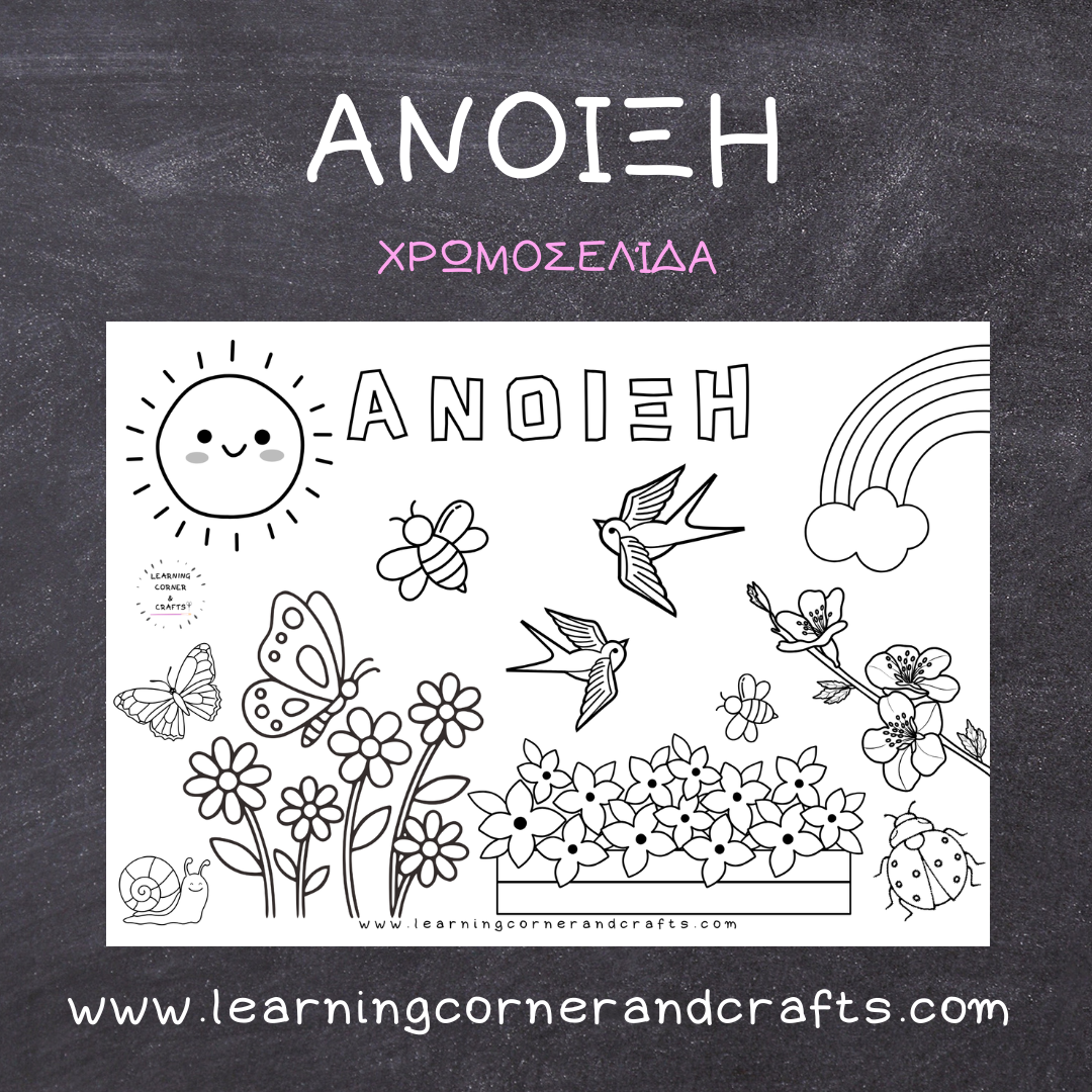 Ανοιξιάτικη χρωμοσελίδα για παιδιά με λουλούδια, πεταλούδες, μέλισσες και πουλιά. Εκτυπώσιμο φύλλο εργασίας για Νηπιαγωγείο και Δημοτικό.